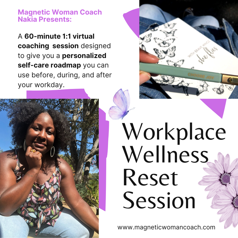 A 60-minute 1:1 virtual coaching session designed to give you a personalized self-care roadmap you can use before, during, and after your workday.